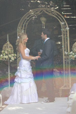 "Liitän mukaan valokuvan, jonka valokuvaajaystäväni huomasi vasta häiden jälkeen. Kuten voit nähdä, kuvassa on kaunis sateenkaari. Tämä on todella yllättävää meistä, koska tuona päivänä ei ollut satanut lainkaan. Vaikka menimme naimisiin lammen yllä (olen aina halunnut mennä naimisiin veden päällä), ei ollut yhtään sumua, kun vesi oli täysin tyyntä ja liikkumatonta. Ihanaa nähdä tämä sateenkaari, koska se tuntuu hyvin erityiseltä merkiltä meille kummallekin ja näyttää, miten taianomainen elämä meillä on yhdessä edessämme."