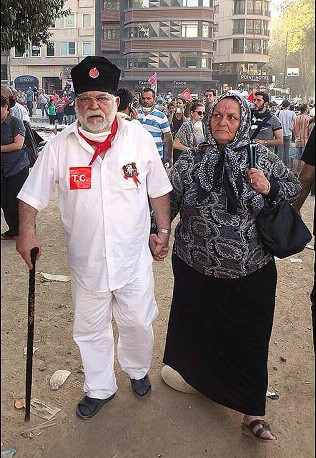 Ja protestiin ja vastukseen liittyy kaikkia yhteiskuntatasoja. Tässä kristallilapsi peittää kasvonsa kyynelkaasua vastaan … ja vanhempi parsikunta liittyy väkijoukkoon Taksimin aukiolla.