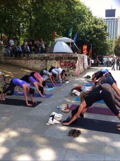 Ja tänä aamuna otettu kuva - jotkut protestoijat tekevät aamujoogaa Taksimin aukiolla.