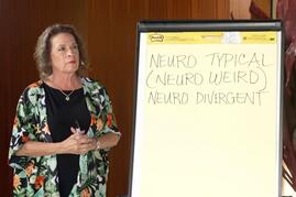 Mutta minun mielipiteeni on, että neuropoikkeava tässä on itse asiassa vähemmän omituinen, koska neurologisessa järjestelmässä ja tietysti aivoissa tapahtuu jotain, mikä periaatteessa sanoo, että … Ai, meillä on vähän keskustelua tässä oikeinkirjoituksesta. (Linda keskustelee jonkun kanssa) Sillä ei ole merkitystä. Sillä ei ole merkitystä.